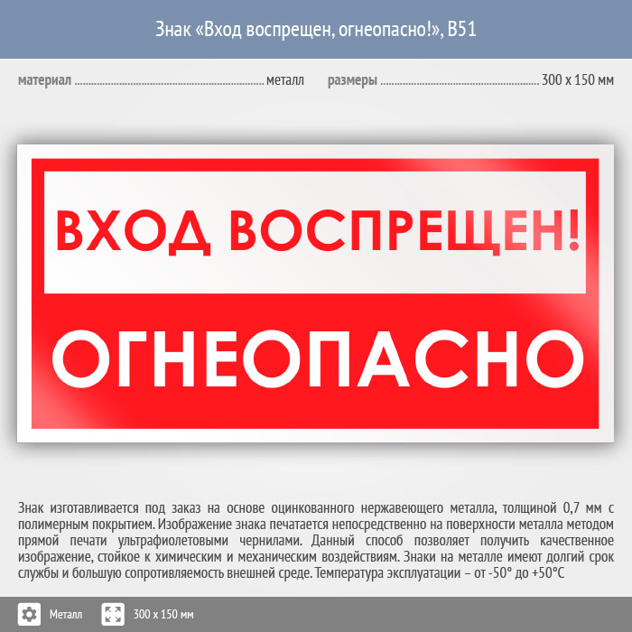 Знак «Вход воспрещен, огнеопасно!», B51 (металл, 300х150 мм) в Лобне купить