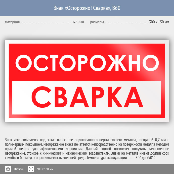 Знак «Осторожно! Сварка», B60 (металл, 300х150 мм) в Лобне купить