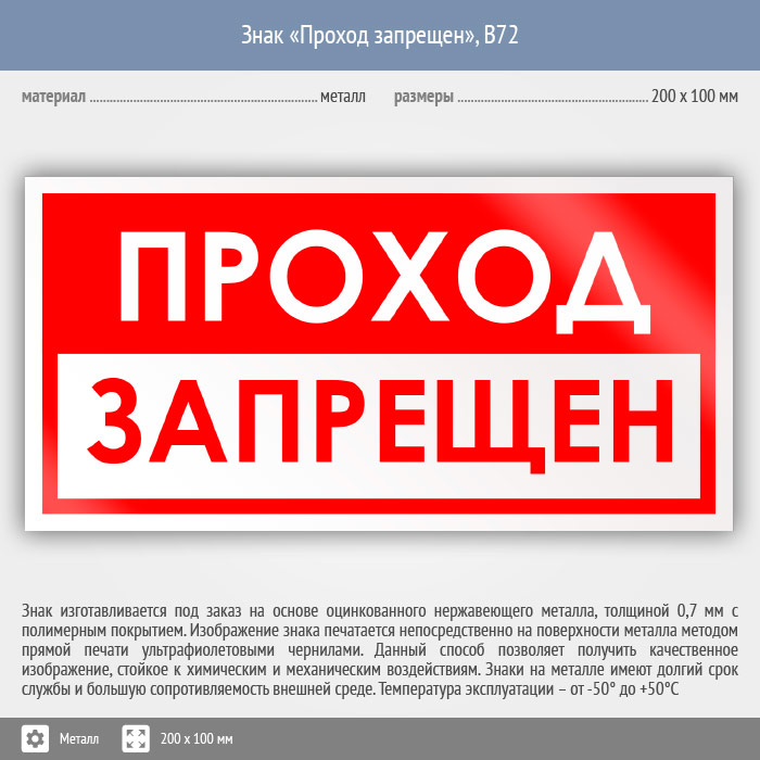 Знак «Проход запрещен», B72 (металл, 200х100 мм) в Лобне купить