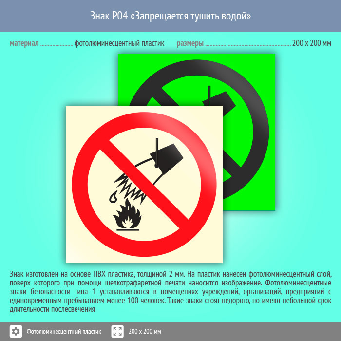 Знак P04 «Запрещается тушить водой» (фотолюминесцентный пластик, 200х200 мм) в Лобне купить