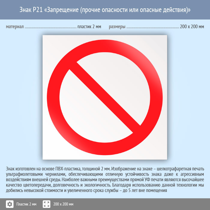 Знак P21 «запрещение (прочие опасности или опасные действия)» (пластик, 200х200 мм) в Лобне купить