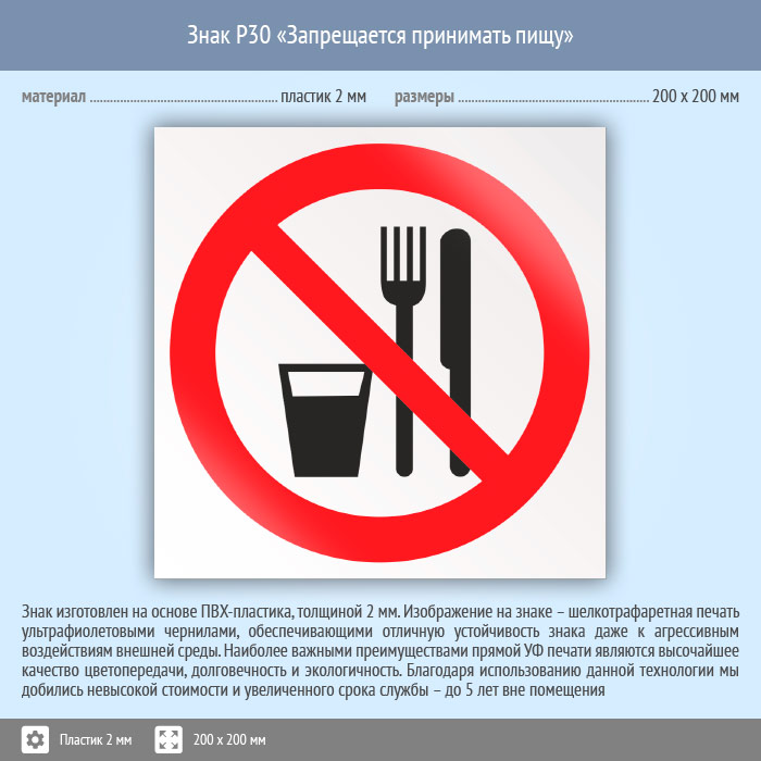 Знак P30 «Запрещается принимать пищу» (пластик, 200х200 мм) в Лобне купить
