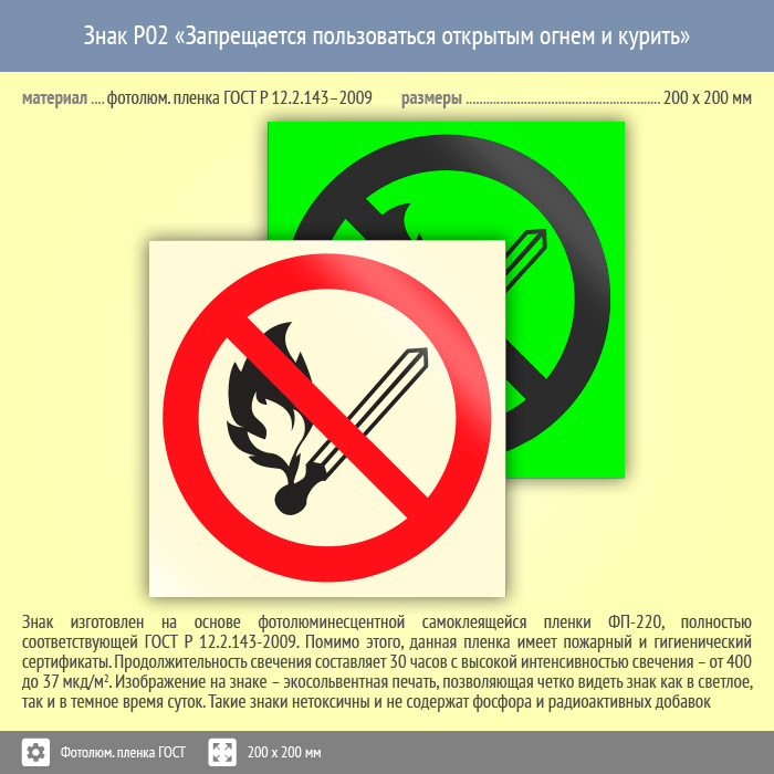 Знак P02 «Запрещается пользоваться открытым огнем и курить» (фотолюминесцентная пленка ГОСТ 34428-2018, 200х200 мм) в Лобне купить