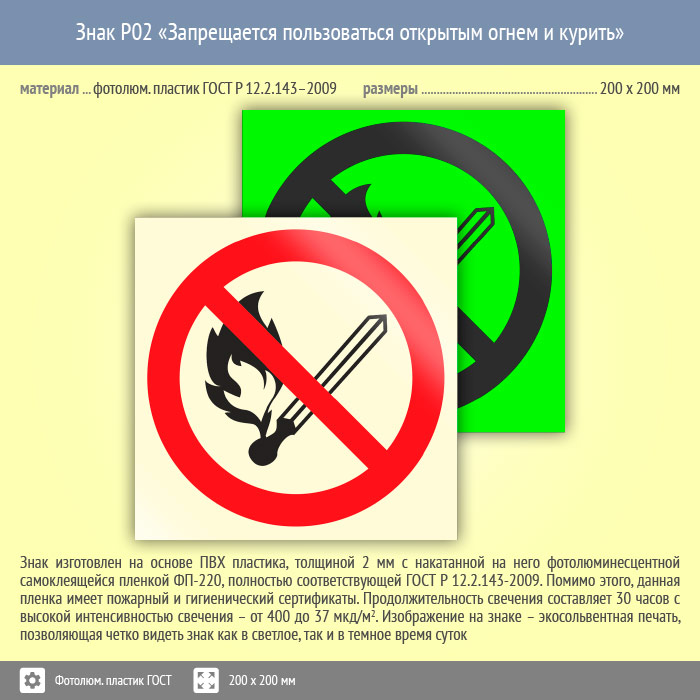 Знак P02 «Запрещается пользоваться открытым огнем и курить» (фотолюминесцентный пластик ГОСТ 34428-2018, 200х200 мм) в Лобне купить