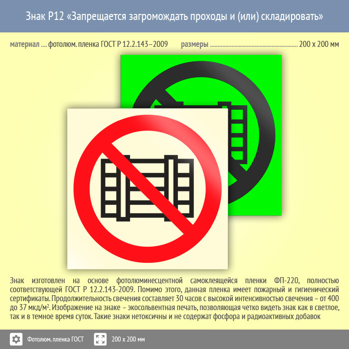 Знак P12 «Запрещается загромождать проходы и (или) складировать» (фотолюминесцентная пленка ГОСТ 34428-2018, 200х200 мм) в Лобне купить