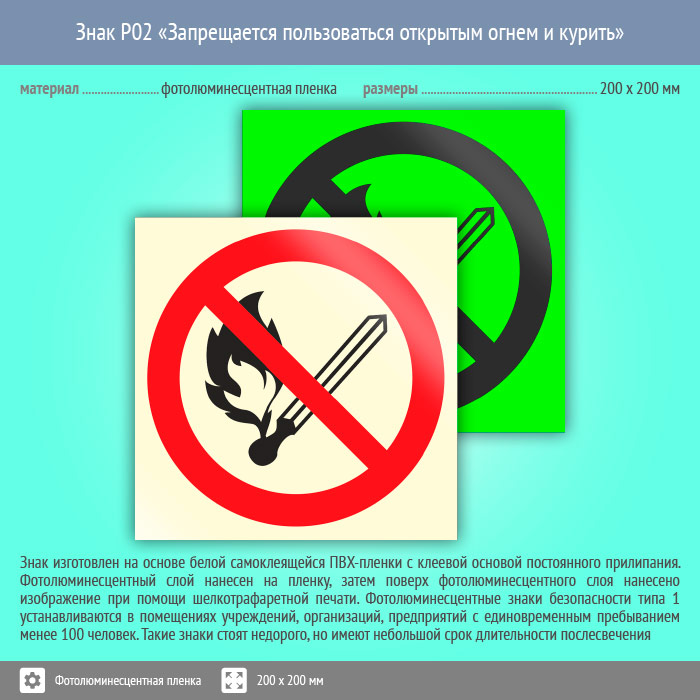Знак P02 «Запрещается пользоваться открытым огнем и курить» (фотолюминесцентная пленка, 200х200 мм) в Лобне купить