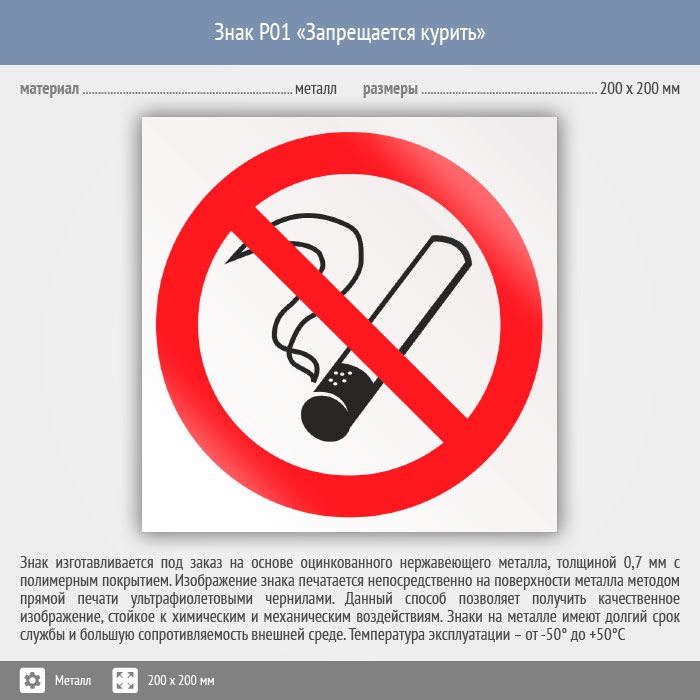 Знак P01 «Запрещается курить» (металл, 200х200 мм) в Лобне купить
