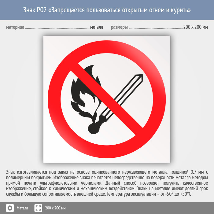 Знак P02 «Запрещается пользоваться открытым огнем и курить» (металл, 200х200 мм) в Лобне купить