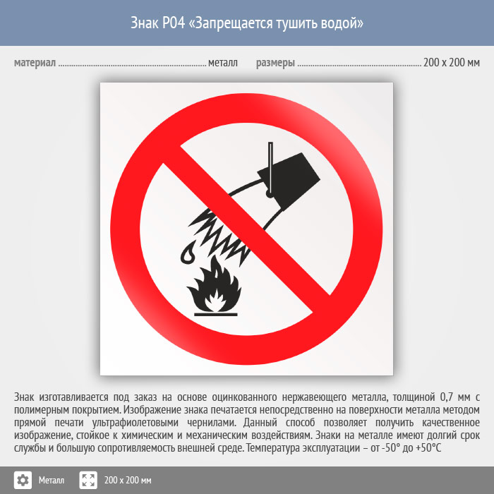 Знак P04 «Запрещается тушить водой» (металл, 200х200 мм) в Лобне купить