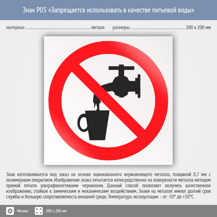 Знак P05 «Запрещается использовать в качестве питьевой воды» (металл, 200х200 мм) в Лобне купить