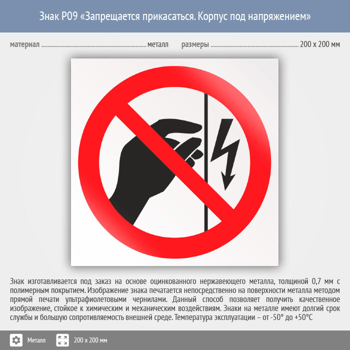 Знак P09 «Запрещается прикасаться. Корпус под напряжением» (металл, 200х200 мм) в Лобне купить