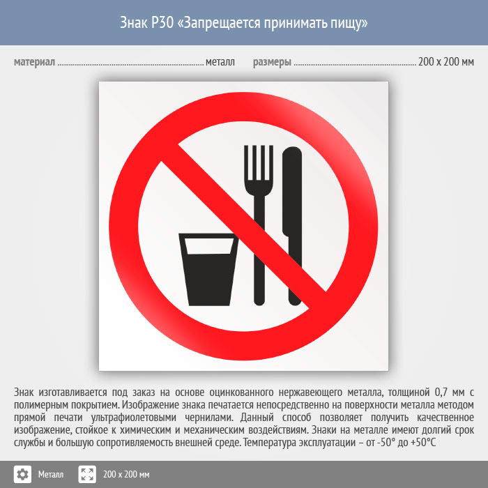 Знак P30 «Запрещается принимать пищу» (металл, 200х200 мм) в Лобне купить
