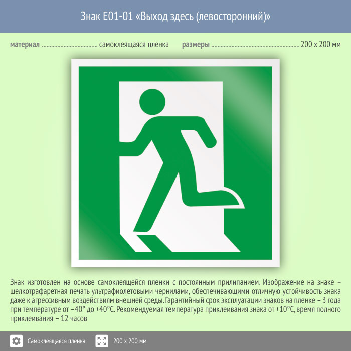 Знак «Выход здесь (левосторонний)» может быть изготовлен любого размера на самоклеящейся пленке, пластике толщиной 0.5, 2 или 4 мм и металле. Также возможно применение фотолюминесцентных и световозвращающих материалов