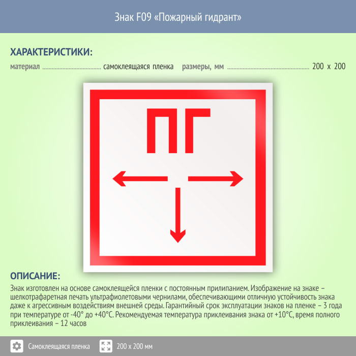 Знак «Пожарный гидрант» указывает место расположения пожарного гидранта. Код знака: F09. Знак «Пожарный гидрант» изготавливается в нескольких типоразмерах, но также может быть изготовлен любого размера на самоклеящейся пленке, пластике толщиной 0.5, 2 или 4 мм и металле. Также возможно применение фотолюминесцентных и световозвращающих материалов