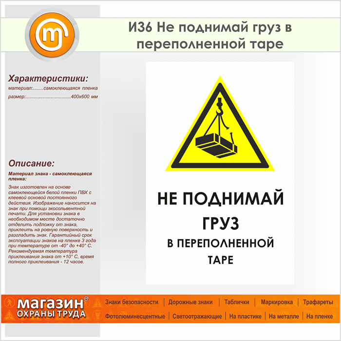 Знак И36 Не поднимай груз в переполненной таре