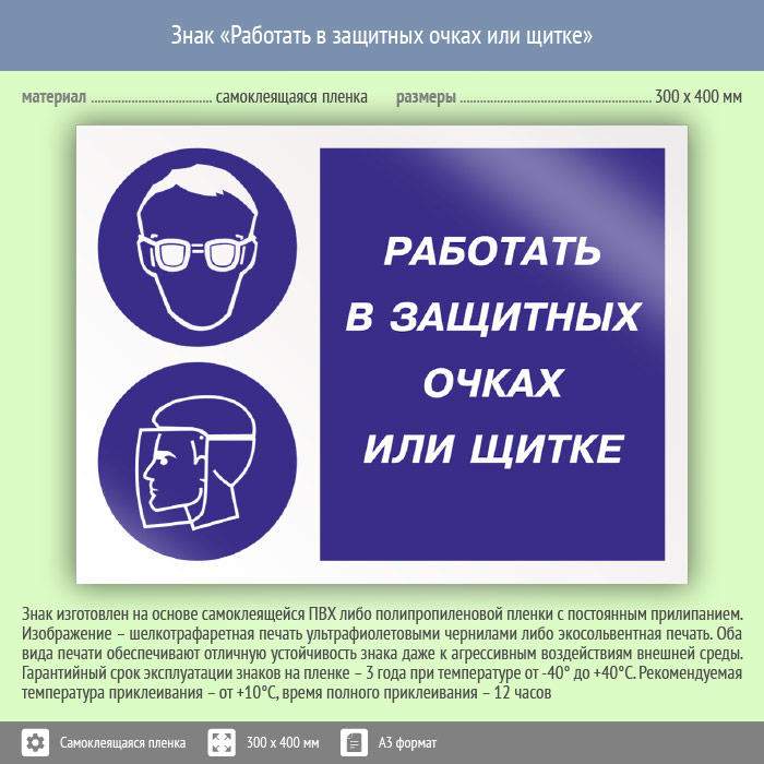 Знак «Работать в защитных очках или щитке» может быть изготовлен любого размера на самоклеящейся пленке, пластике толщиной 0.5, 2 или 4 мм и металле. Также возможно применение фотолюминесцентных и световозвращающих материалов