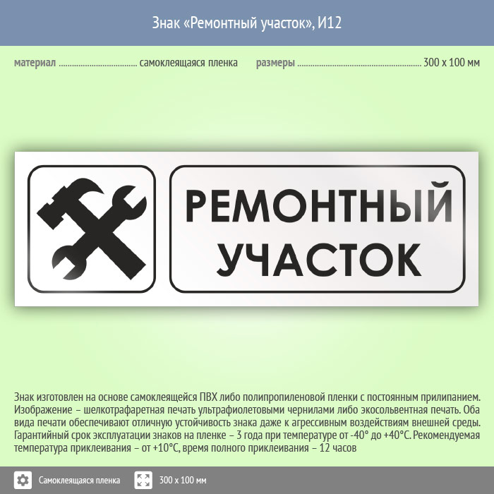 Знак «Ремонтный участок» может быть изготовлен любого размера на самоклеящейся пленке, пластике толщиной 0.5, 2 или 4 мм и металле. Также возможно применение фотолюминесцентных и световозвращающих материалов