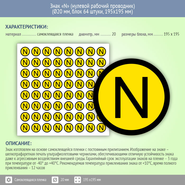 Знак (плакат) «N» (нулевой рабочий проводник), S47 (пленка, диаметр 20 мм, блок 64 штуки, 195х195 мм) в Лобне купить