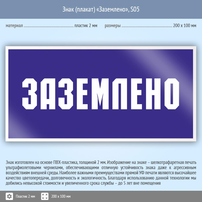 Знак (плакат) «Заземлено», S05 (пластик, 200х100 мм) в Лобне купить