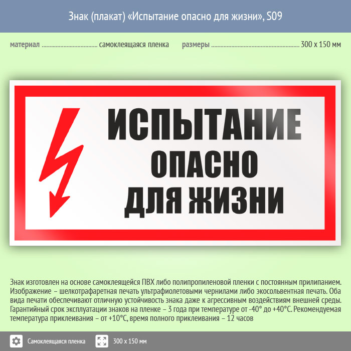 Знак (плакат) «Испытание опасно для жизни», S09 (пленка, 300х150 мм) в Лобне купить