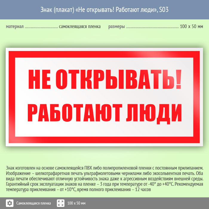 Знак (плакат) «Не открывать! Работают люди», S03 (пленка, 100х50 мм) в Лобне купить