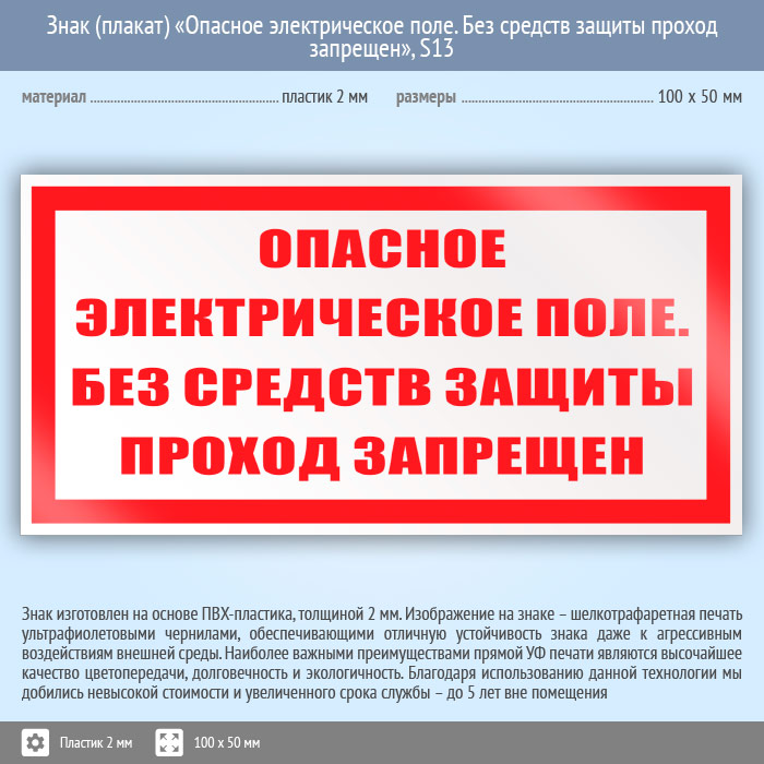 Знак (плакат) «Опасное электрическое поле. Без средств защиты проход запрещен», S13 (пластик, 100х50 мм) в Лобне купить