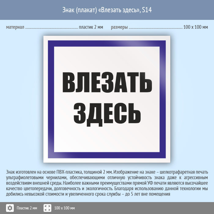 Знак (плакат) «Влезать здесь», S14 (пластик, 100х100 мм) в Лобне купить