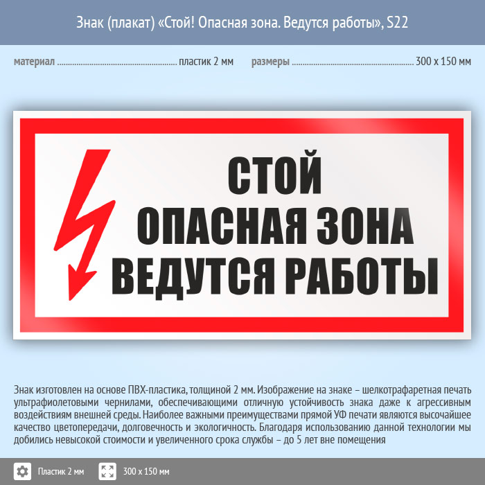 Знак (плакат) «Стой! Опасная зона. Ведутся работы», S22 (пластик, 300х150 мм) в Лобне купить