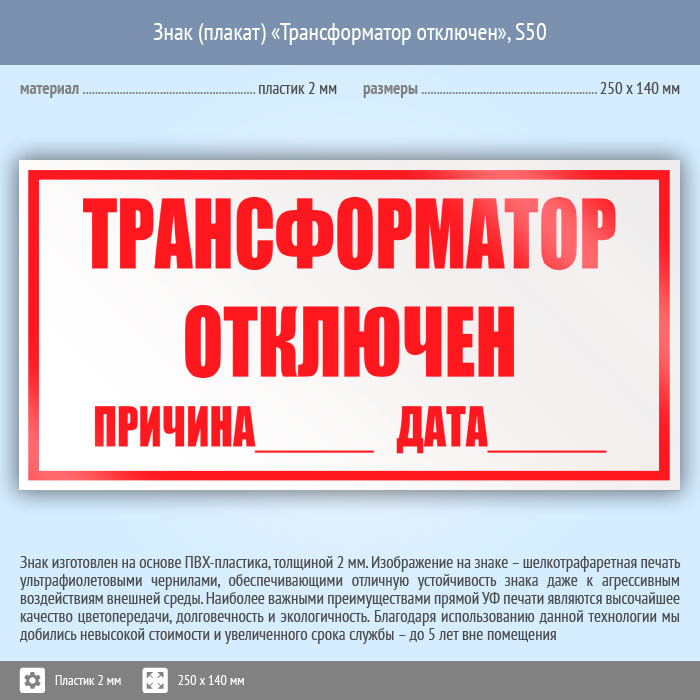 Знак (плакат) «Трансформатор отключен», S50 (пластик, 250х140 мм) в Лобне купить