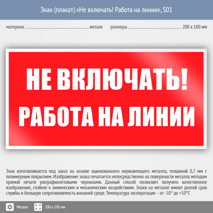 Знак (плакат) «Не включать! Работа на линии», S01 (металл, 200х100 мм) в Лобне купить
