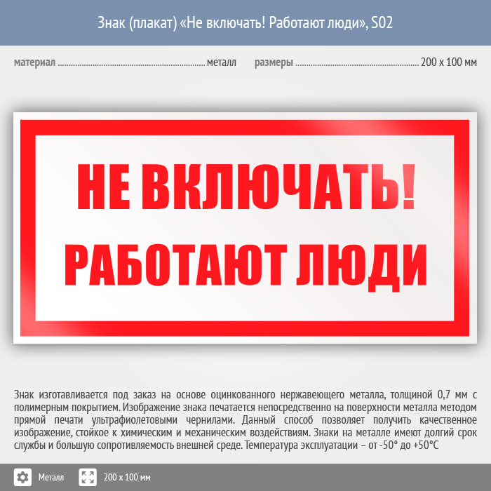 Знак (плакат) «Не включать! Работают люди», S02 (металл, 200х100 мм) в Лобне купить