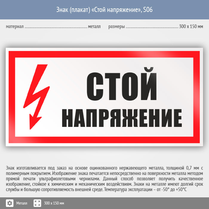 Знак (плакат) «Стой напряжение», S06 (металл, 300х150 мм) в Лобне купить
