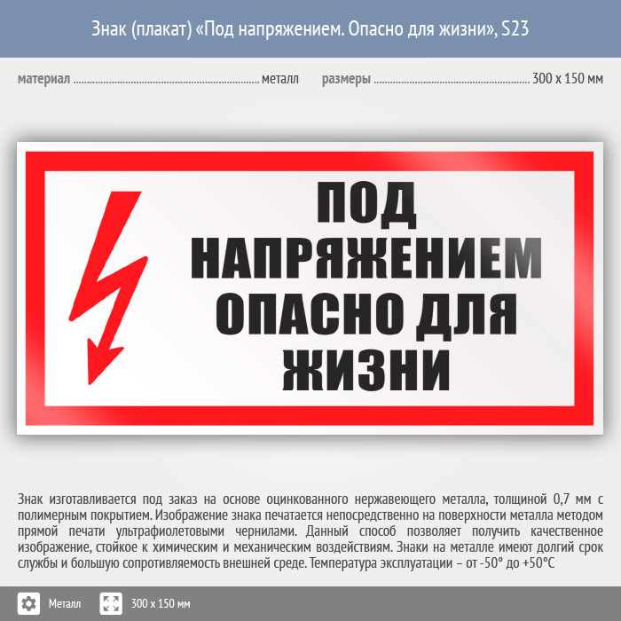 Знак (плакат) «Под напряжением. Опасно для жизни», S23 (металл, 300х150 мм) в Лобне купить