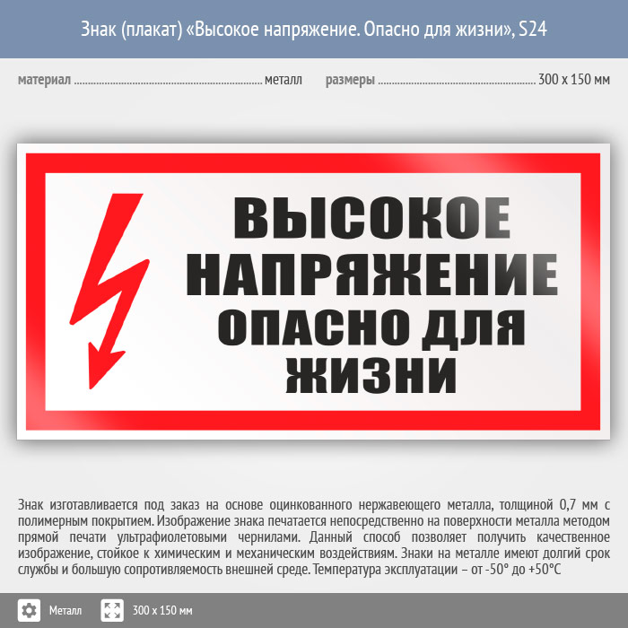 Знак (плакат) «Высокое напряжение. Опасно для жизни», S24 (металл, 300х150 мм) в Лобне купить