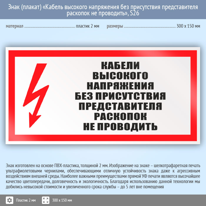 Знак (плакат) «Кабель высокого напряжения без присутствия представителя раскопок не проводить», S26 (пластик, 300х150 мм) в Лобне купить