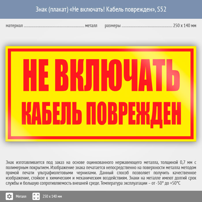 Знак (плакат) «Не включать! Кабель поврежден», S52 (металл, 250х140 мм) в Лобне купить