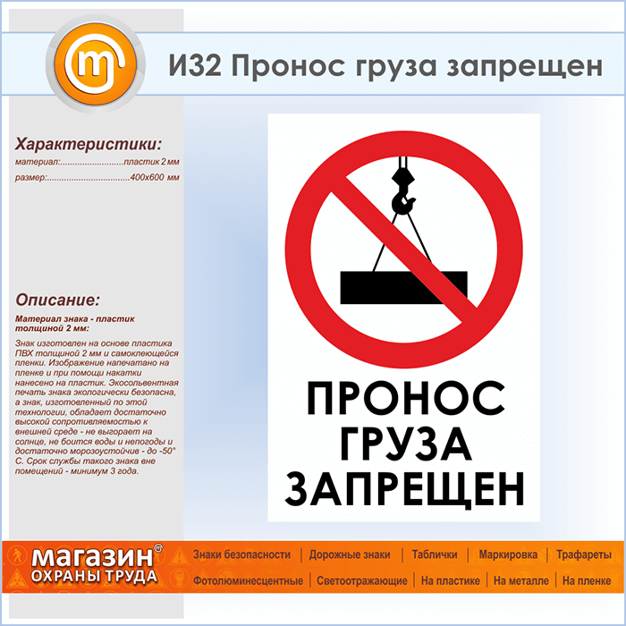 Знак «Пронос груза запрещен», И32 (пластик, 400х600 мм) в Лобне купить