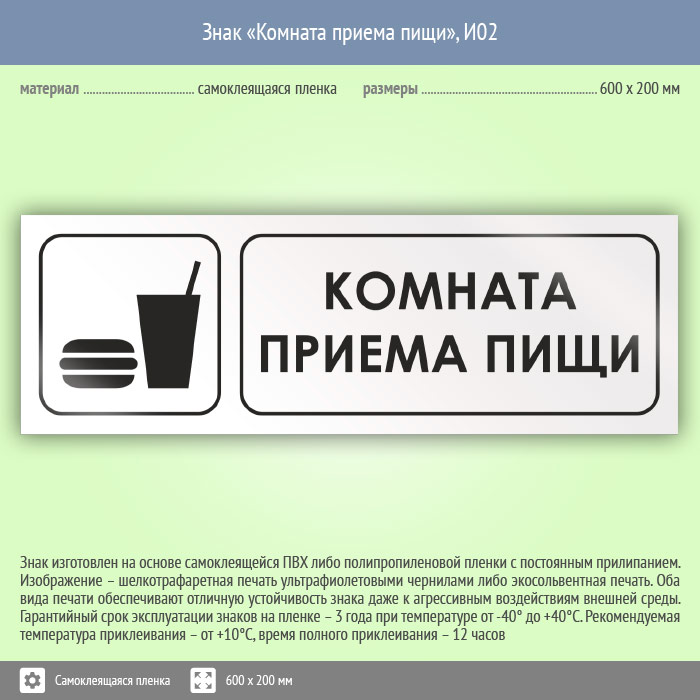 Знак «Комната приема пищи», И02 (пленка, 600х200 мм) в Лобне купить