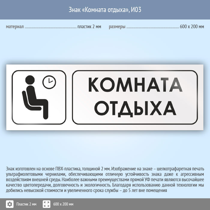 Знак «Комната отдыха», И03 (пластик, 600х200 мм) в Лобне купить