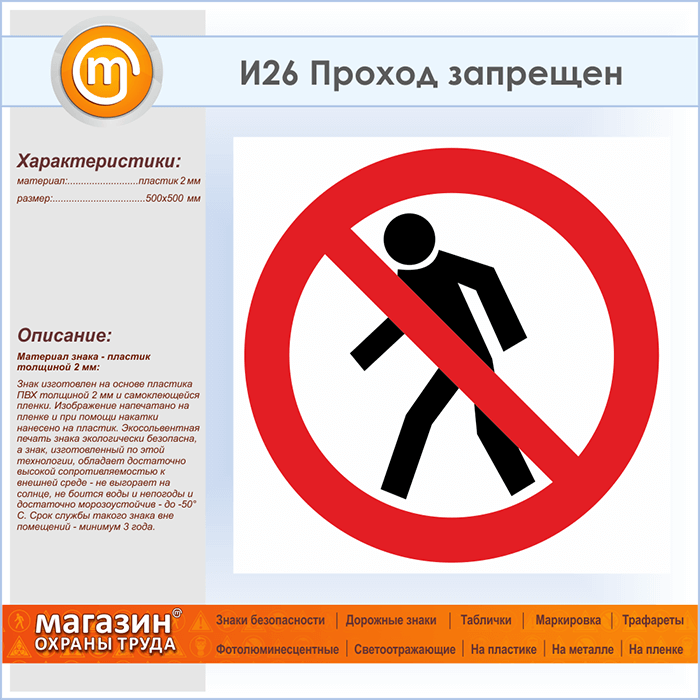Знак «Проход запрещен», И26 (пластик, 500х500 мм) в Лобне купить