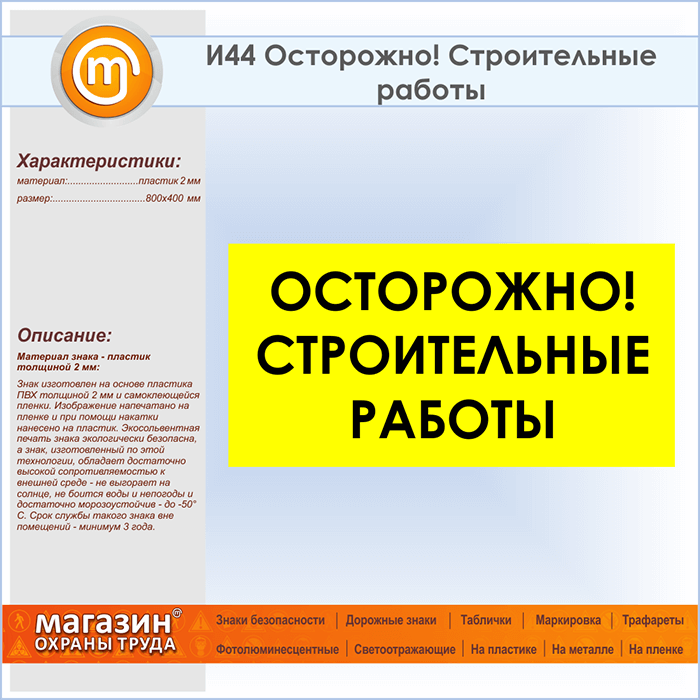 Знак «Осторожно! Строительные работы», И44 (пластик, 800х400 мм) в Лобне купить