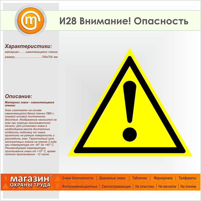 Знак «Внимание! Опасность», И28 (пленка, сторона 700 мм) в Лобне купить