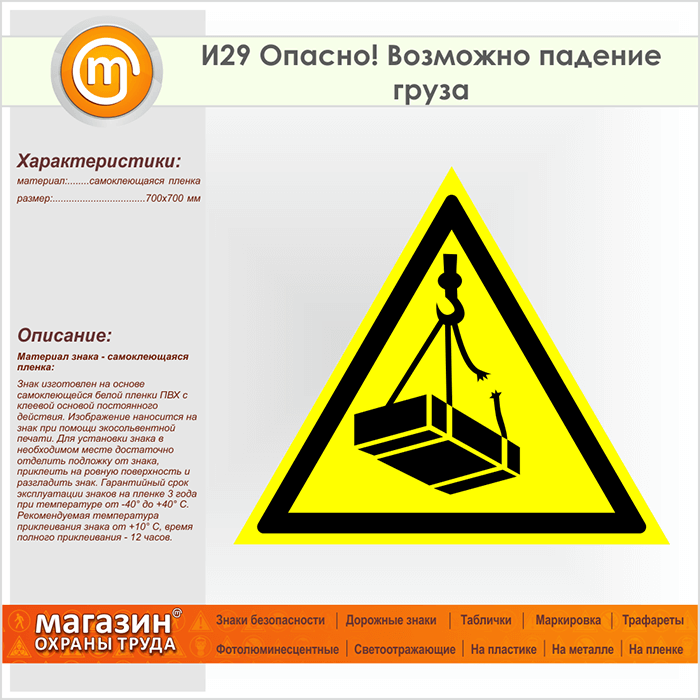 Знак «Опасно! Возможно падение груза», И29 (пленка, сторона 700 мм) в Лобне купить