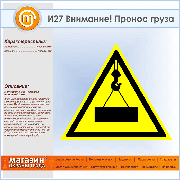 Знак «Внимание! Пронос груза», И27 (пластик, сторона 700 мм) в Лобне купить