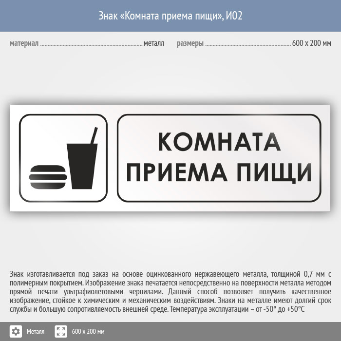 Знак «Комната приема пищи», И02 (металл, 600х200 мм) в Лобне купить