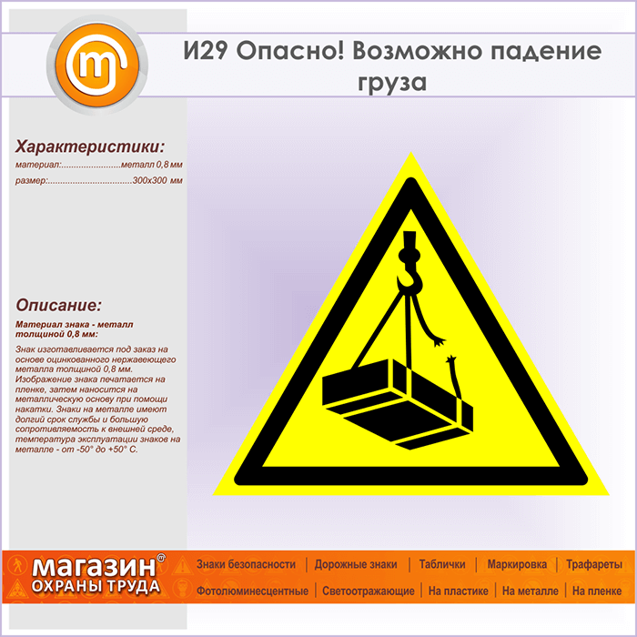 Знак «Опасно! Возможно падение груза», И29 (металл, сторона 300 мм) в Лобне купить