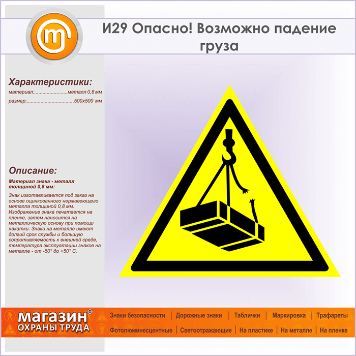 Знак «Опасно! Возможно падение груза», И29 (металл, сторона 500 мм) в Лобне купить