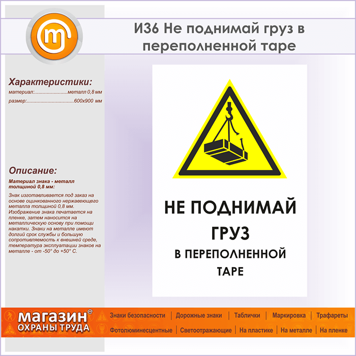 Знак «Не поднимай груз в переполненной таре», И36 (металл, 600х900 мм) в Лобне купить