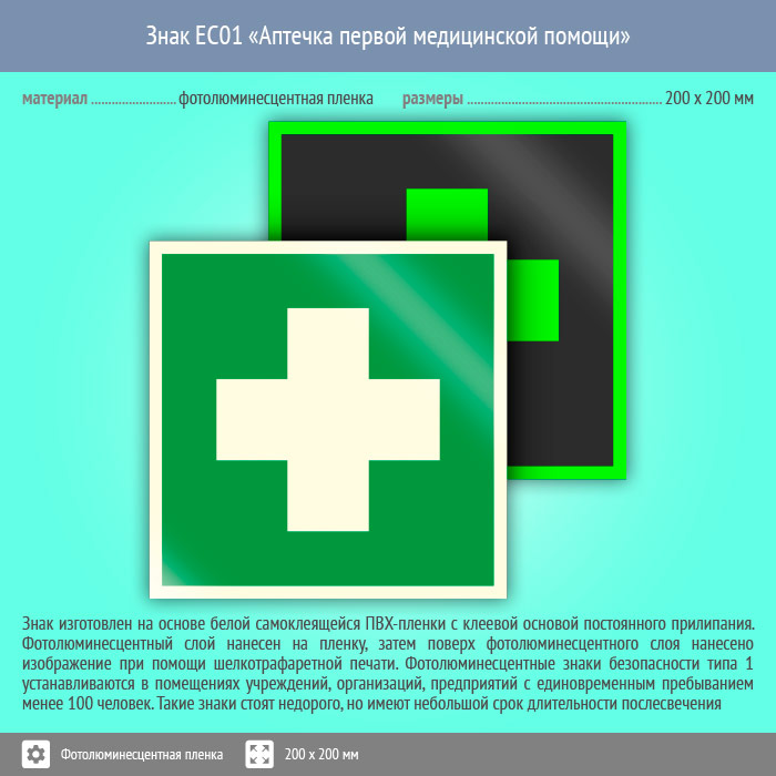 Знак EC01 «Аптечка первой медицинской помощи» (фотолюминесцентная пленка, 200х200 мм) в Лобне купить
