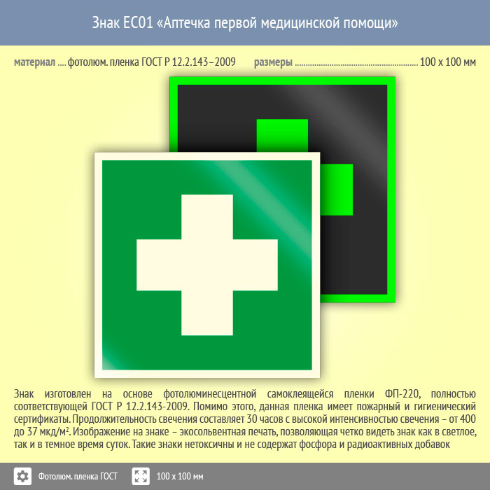 Знак EC01 «Аптечка первой медицинской помощи» (фотолюминесцентная пленка ГОСТ 34428-2018, 100х100 мм) в Лобне купить